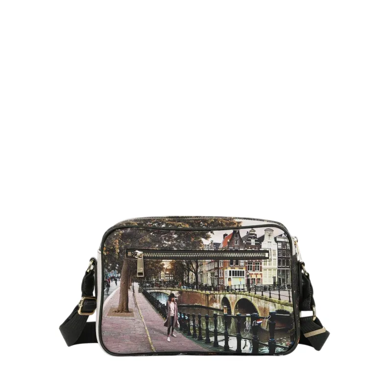 The YNot? Yes Bag medium crossbody is crafted from durable, waterproof fabric with leather accents, designed to combine fashion-forward style with everyday functionality. It features an adjustable nylon strap, three zipped compartments, and a lined interior with utility pockets.
