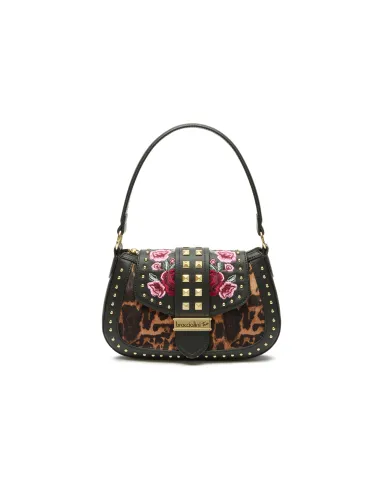 Adorned with a vibrant mix of gold studs, pony-effect animalier inserts, and embroidered floral details in shades of red and pink, this bag embodies the fusion of rock spirit and romantic sophistication.