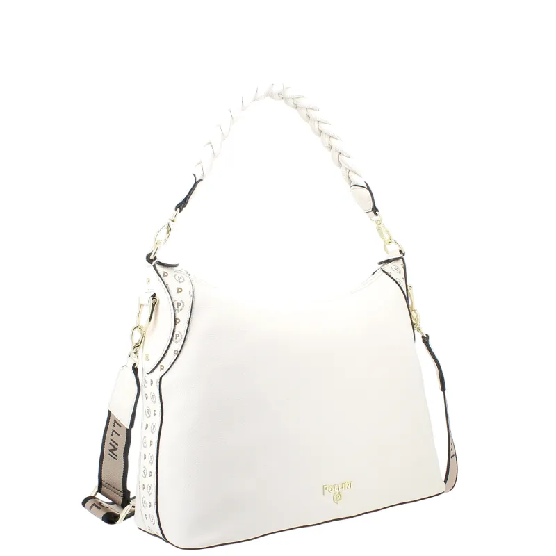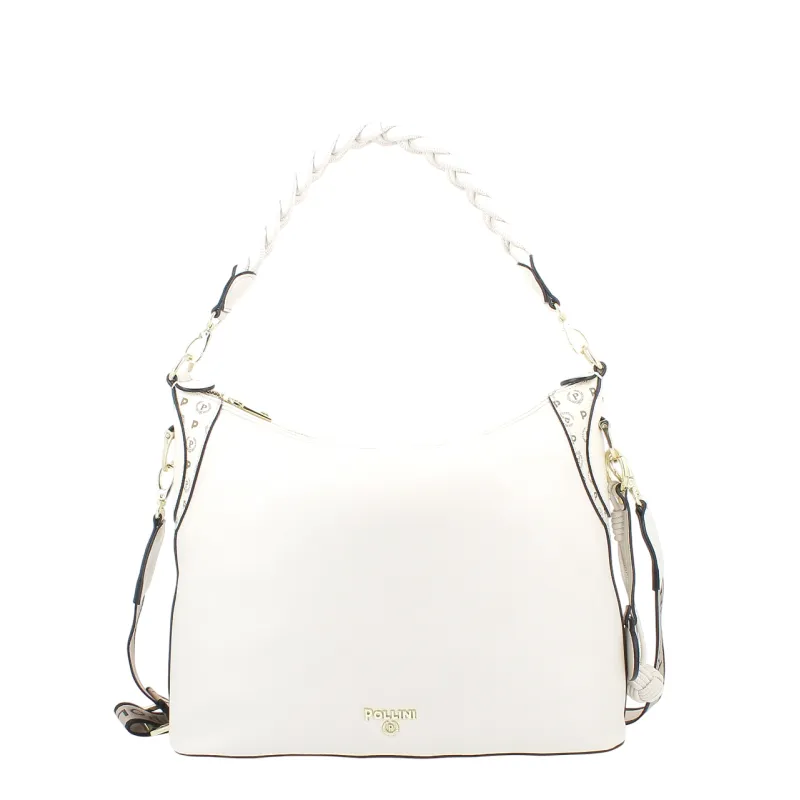 The medium Charisma shoulder bag by Pollini stands out for its soft silhouette with sculpted 3D inspired corners, offering a refined balance of modern style and functionality. The woven handle adds a sophisticated handcrafted touch, while the adjustable jacquard logo shoulder strap ensures comfort and versatility. Nickel finish hardware enhances the design with a sleek and contemporary shine. The P Alloro logo charm adds personality and completes the accessory with a distinctive signature detail. With its practical zip closure, this shoulder bag is perfect for elevating everyday looks with elegance and ease.