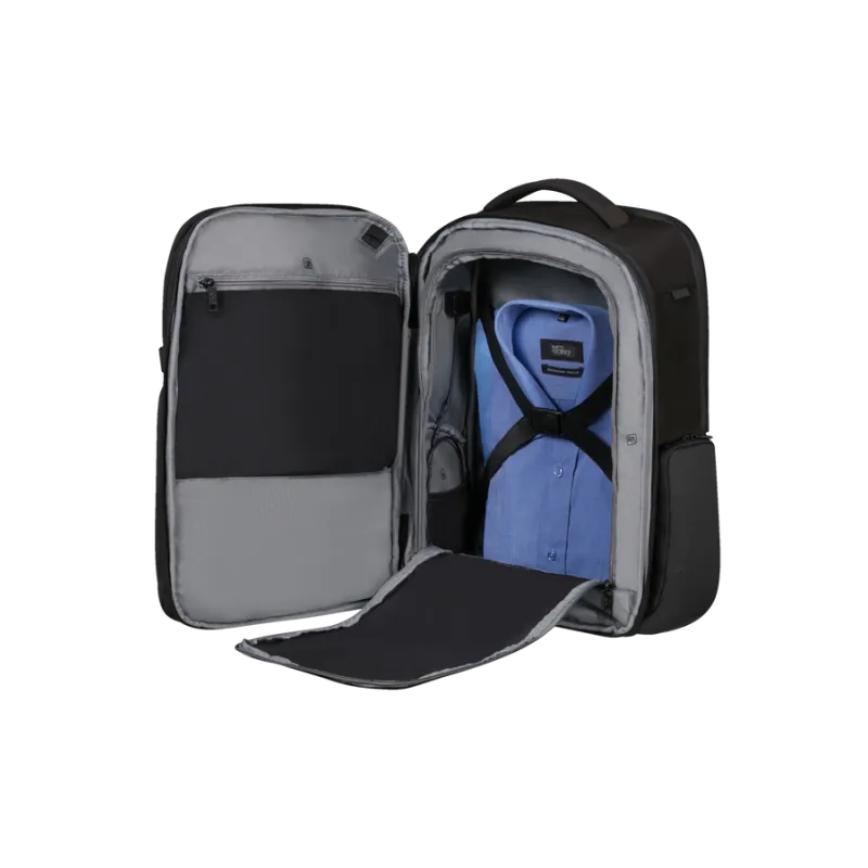 Design and functionality for the backpack from Samsonite's Biz2Go collection, made from regenerated fabrics, equipped with a double zipped compartment. Main compartment fits a change of clothes and the other one is equipped with a padded pocket for a 17,3" computer and tablet. The backpack has a front pocket and side pockets with zip, integrated USB port to recharge electronic devices, padded and breathable back with trolley attachment pocket, padded and adjustable shoulder straps.