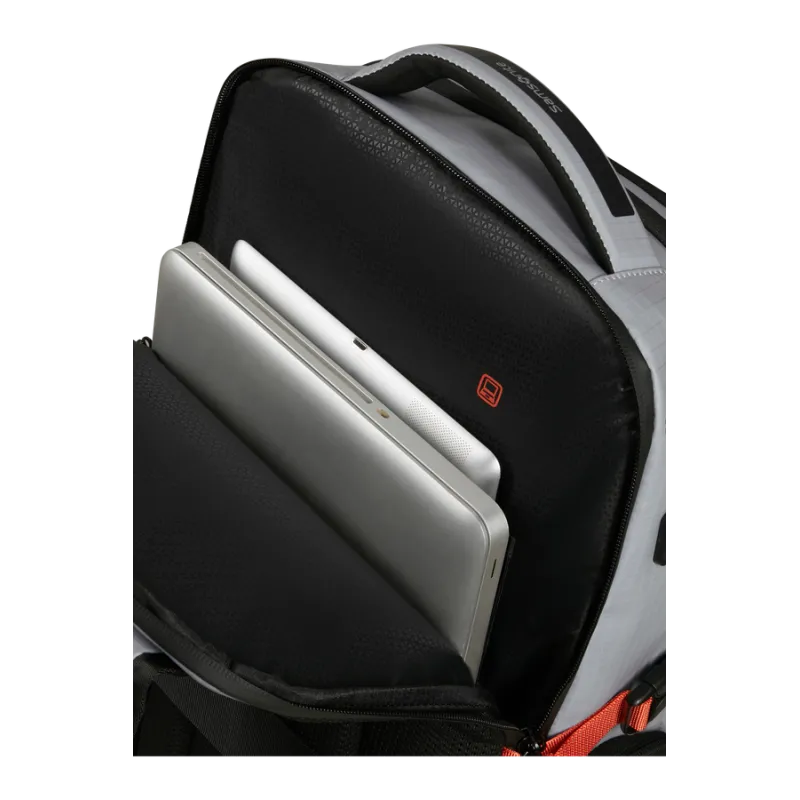 Inside, the backpack offers a well-structured layout with a 15.6” laptop compartment, a tablet pocket up to 10.5”, document compartment, clothing compartment, and advanced internal organization.