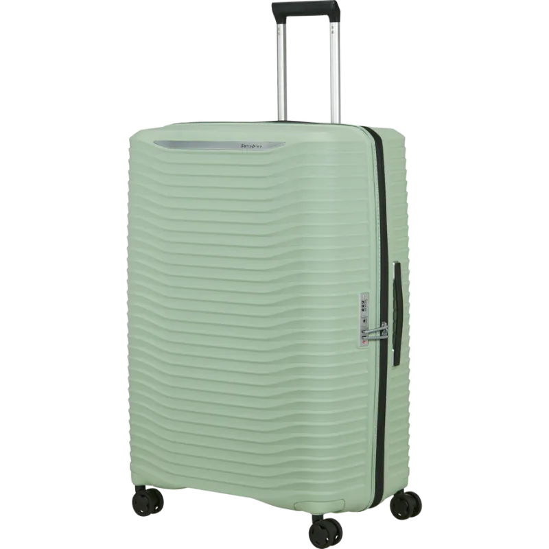Lightweight and strong extra-large expandable trolley from the Upscape collection by Samsonite, made of 100 % polypropylene, equipped with top and side handles, double compartment with organised divider with zipped pocket and tie-down straps, combination lock and tsa required for US travel, 4-wheel towing, integrated address plate.