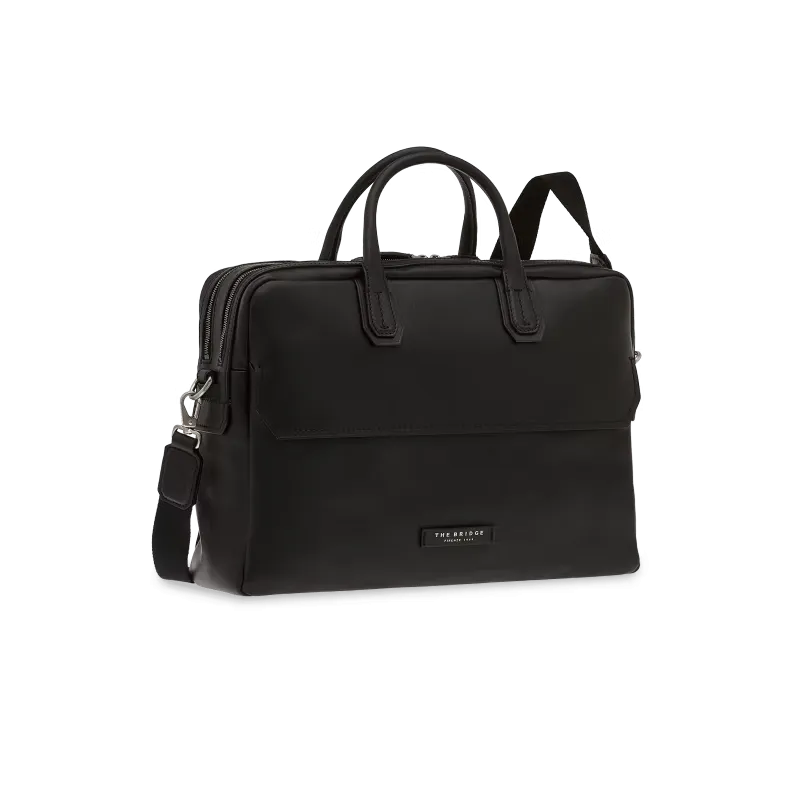 Two handles Laptop Briefcase from The Bridge's Williamsburg collection, made of fine leather, with adjiustable shoulder strap, double compartment with zip opening, one of wich has a dedicated compartment for notebook and tablet, in the back it is equipped with trolley sleeve