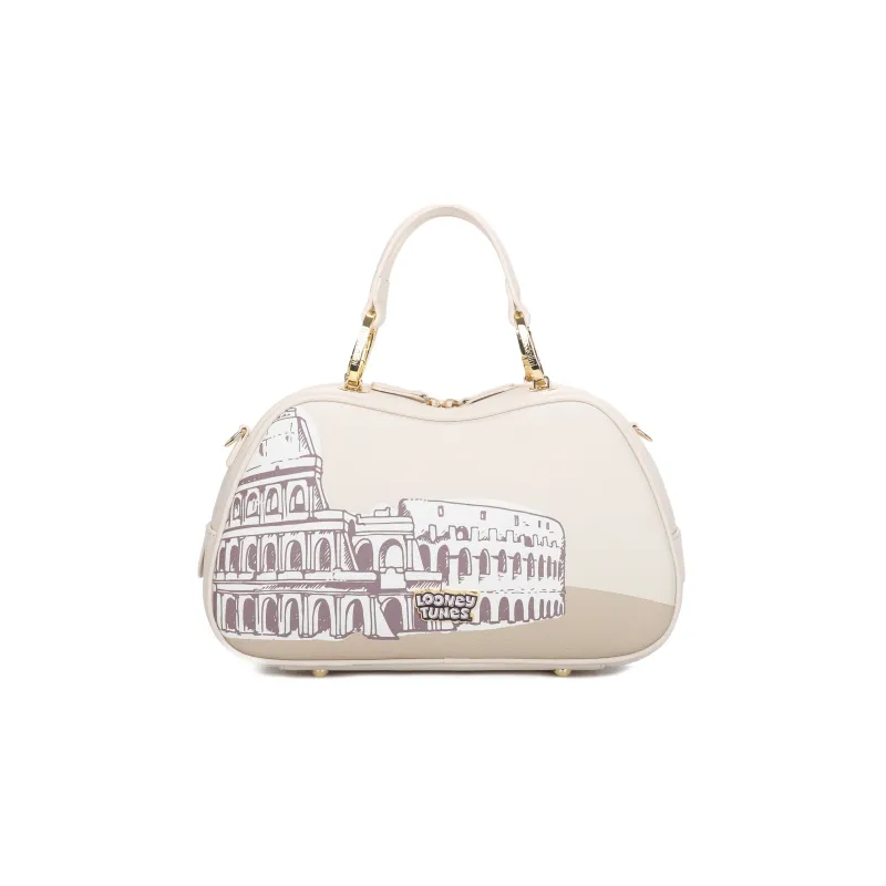 Its compact structured silhouette is beautifully decorated with a print inspired by Rome, starring Porky and Petunia in a romantic scene before the Colosseum.