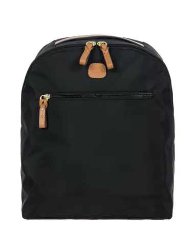 Medium sized backpack from the X-Collection by Brics, made of recycled nylon, lightweight and strong with leather trim. Adjustable shoulder straps make it comfortable to wear and with the small leather top handle it can also be carried by hand. Interior pockets, one of which is zipped. On the outside, it has a zipped pocket on the front and a zipped pocket on the back, ideal for storing valuables. The main opening is zipped. On the back there is a strap for attaching to the trolley handle.