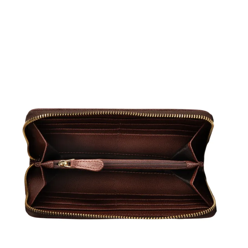 The gold-tone hardware adds a refined touch, while the zip-around closure ensures convenience and security. Inside, the layout is designed for organization: 12 card slots, document pockets, and a zip coin compartment.