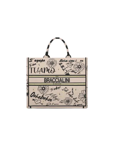 La borsa a mano di grandi dimensioni della collezione Queen di Braccialini è una dichiarazione d’amore allo stile, alla creatività e alla femminilità. Realizzata in tessuto pregiato, si distingue per i ricami esclusivi che celebrano il linguaggio universale dell’amore: scritte romantiche e fiori stilizzati si intrecciano in un raffinato gioco grafico, completato dal logo Braccialini ricamato.