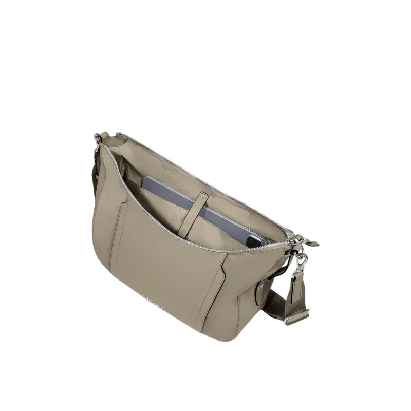 Borsa donna a tracolla della collezione Circle di Piquadro, realizzata in tessuto riciclato e pelle, dotata di unico comparto con chiusura con zip, tasca interna porta Ipad, tracolla regolabile.