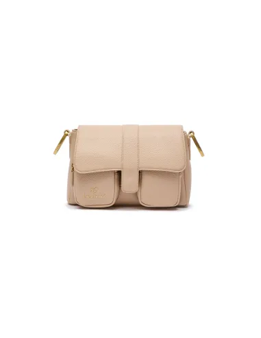 Realizzata con linee strutturate e dettagli luminosi, si distingue per la patta frontale e le doppie tasche con zip, che offrono spazio e funzionalità senza rinunciare allo stile. I dettagli in metallo dorato impreziosiscono la silhouette, conferendole un fascino raffinato e moderno.