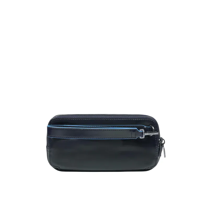 Pochette a tre comparti della collezione Blue Square di Piquadro, dotata di tracolla in nastro regolabile e removibile, manico in pelle removibile, 12 spazi interni per carte di credito con protezione anti-frode RFID.