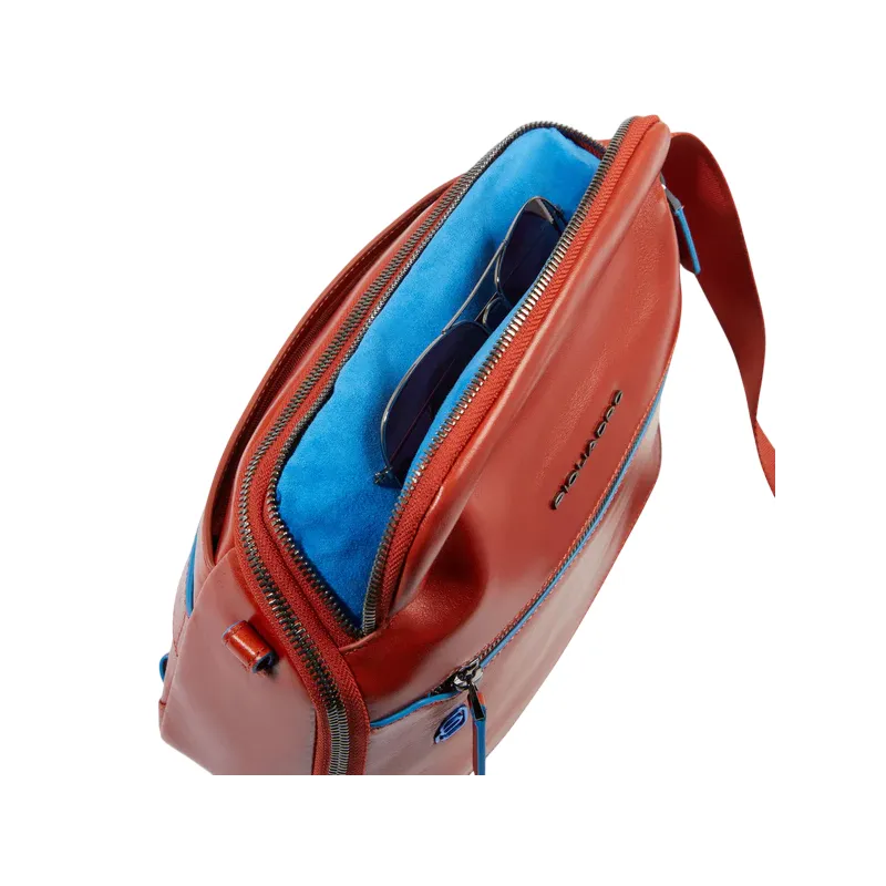 Borsello uomo orizzontale della collezione Blue Square di Piquadro, realizzato in pelle naturale, dotato di due comparti con cerniera, il principale gode di ampia apertura consentendo facile accesso e visione degli accessori inseriti, tasca superiore portaocchiali, tasca posteriore per l'aggancio al trolley, tracolla regolabile, portachiavi sganciabile.