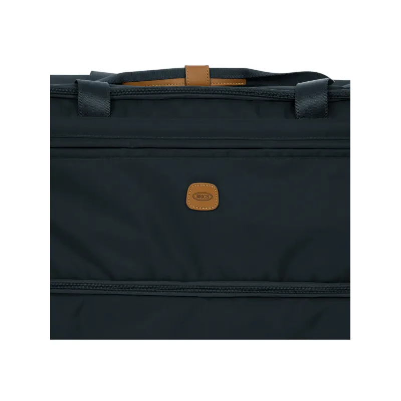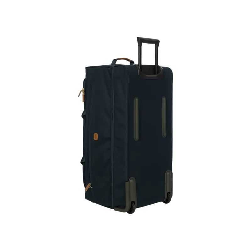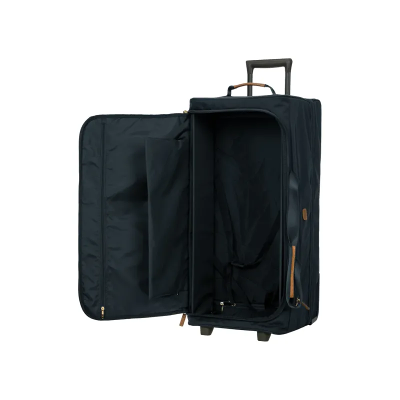 Due ruote di alta qualita garantiscono una movimentazione scorrevole e stabile, supportate da piedini di appoggio che mantengono il borsone fermo in posizione verticale. I dettagli in vera pelle e la fodera in morbido tessuto impreziosiscono il design, conferendo al borsone un aspetto elegante e distintivo, tipico della X-Collection.