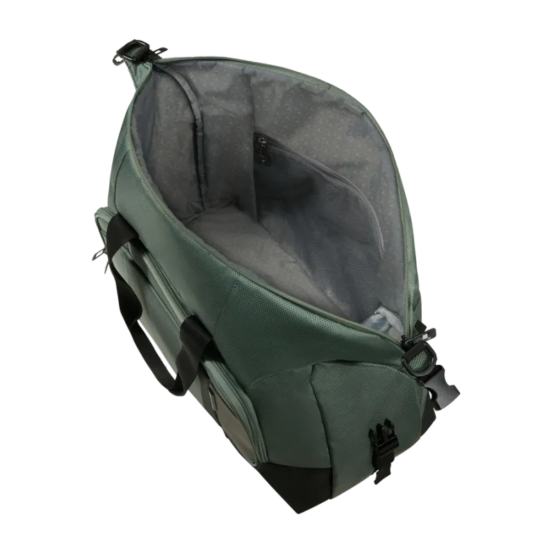 Borsone cabina della collezione Respark di Samsonite, realizzato interamente con materiali riciclati, dotato di due manici, chiusura con cerniera, tracolla regolabile e removibile, passante posteriore per l'aggancio al trolley.