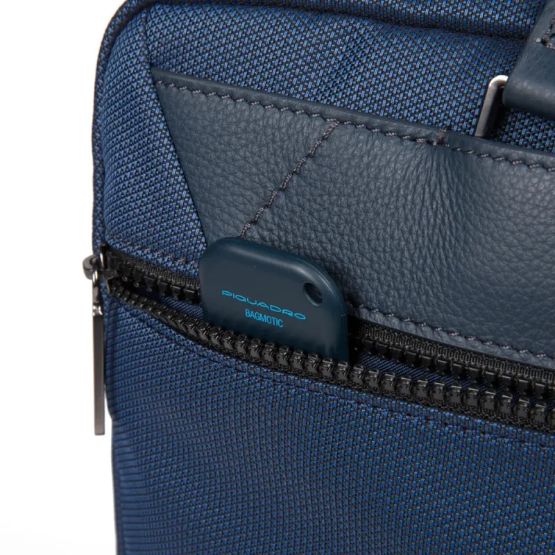 Cartella due manici fast-Check della collezione Trakai di Piquadro, realizzata in tessuto rigenerato e pelle naturale, dotata di doppio scomparto con apertura con cerniera, tracolla regolabile e removibile, passante posteriore per aggancio al trolley, doppia tasca frontale con zip.