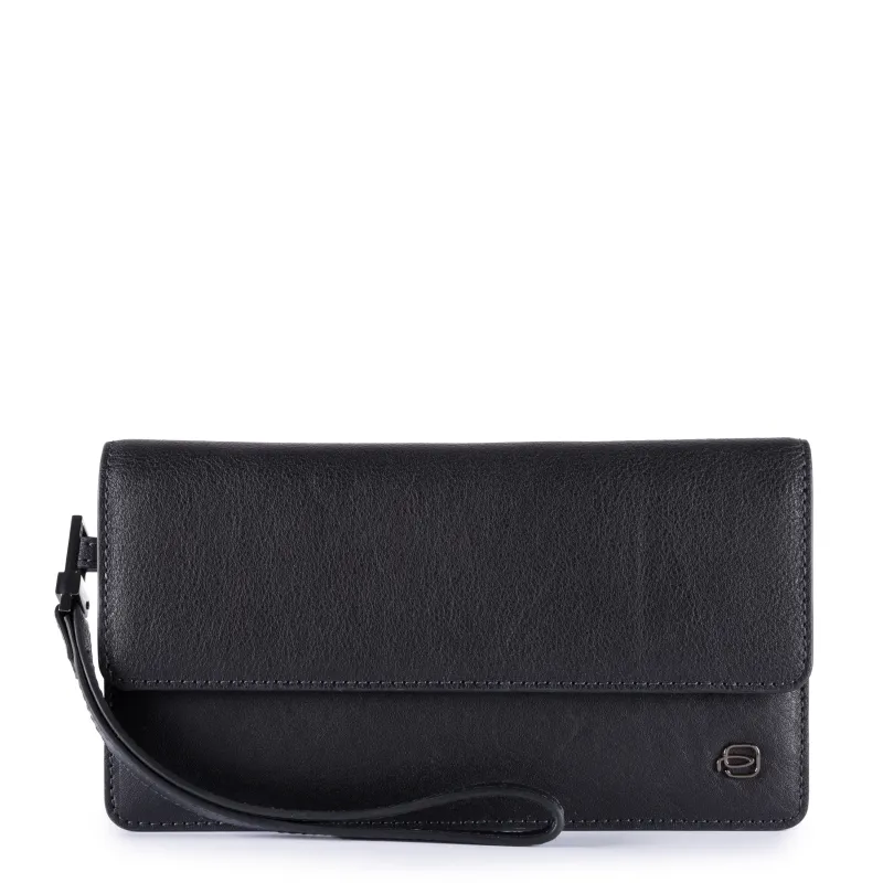 Pochette a mano della collezione Black square di Piquadro, realizzata in pelle naturale conciata al vegetale, dotata manico staccabile, apertura con patta ed automatico, tre comparti interni, 4 spazi per carte di credito.