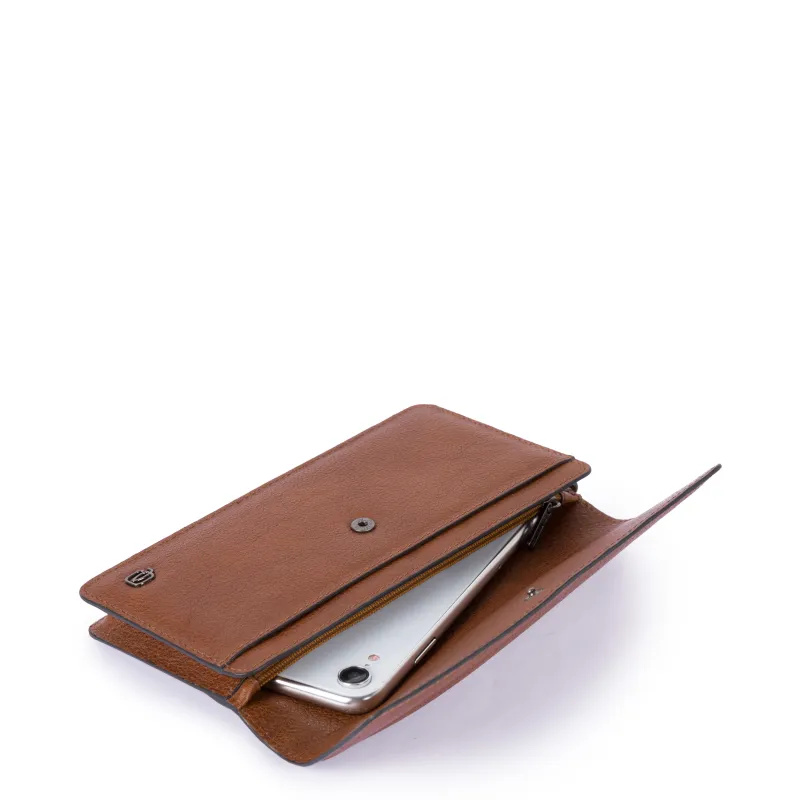 Pochette a mano della collezione Black square di Piquadro, realizzata in pelle naturale conciata al vegetale, dotata manico staccabile, apertura con patta ed automatico, tre comparti interni, 4 spazi per carte di credito.