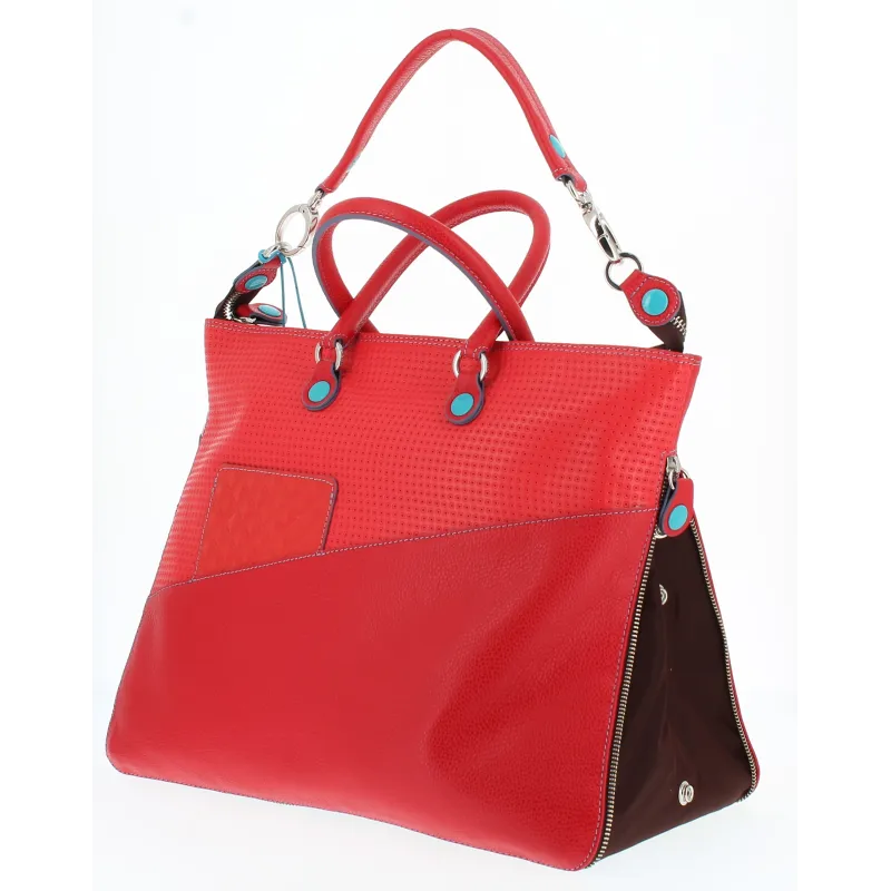 Week è una delle piu' riconosciute borse trasformabili di Gabs, in questa variante realizzata in morbida pelle naturale dall'effetto martellato da un lato e con tre diversi pellami abbinati dall'altro, dotata di apertura con cerniera, zip lungo il fianco che consente di aumentarne le dimensioni e cambiarne la forma, doppio manico, tracolla sottobraccio in pelle removibile, base per mantenerne la forma e tracolla aggiuntiva in nastro regolabile e removibile.