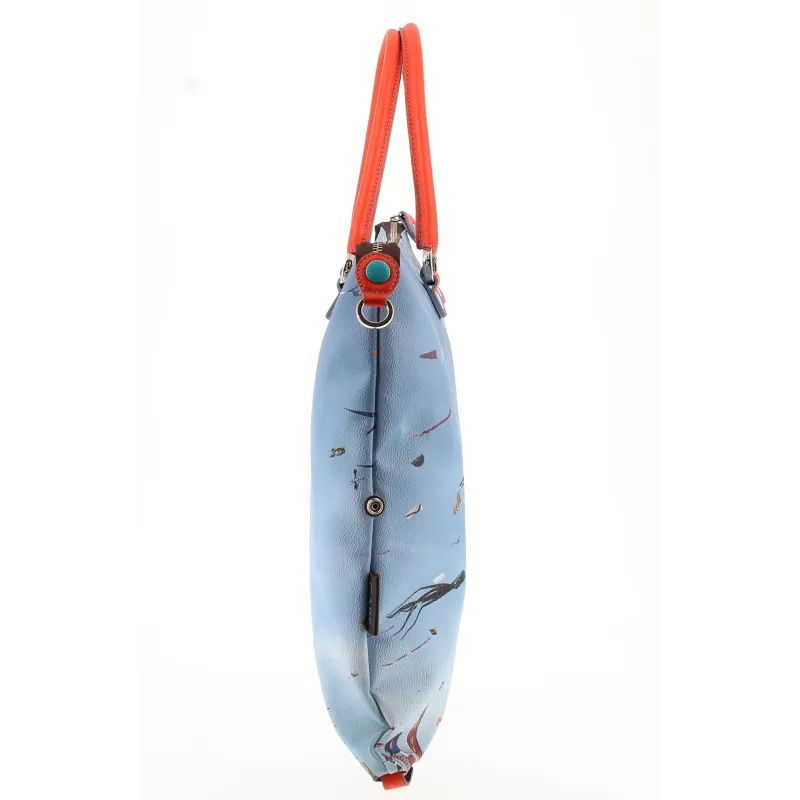 Realizzata in tessuto goffrato (materiale particolarmente resistente e lavabile) stampato con finiture in pelle,dotata di apertura con cerniera,doppio manico,tracolla in nastro removibile,base interna che aiuta a manetenere la forma della borsa,borsa pieghevole interna.