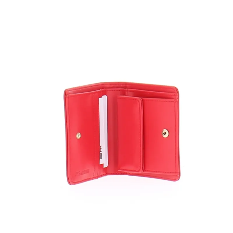 Portafogli donna dalle piccole dimensioni della collezione Moschino Love, dotato di apertura con automatico, comparto interno per banconote, spazi per carte di credito e comparto portamonete.