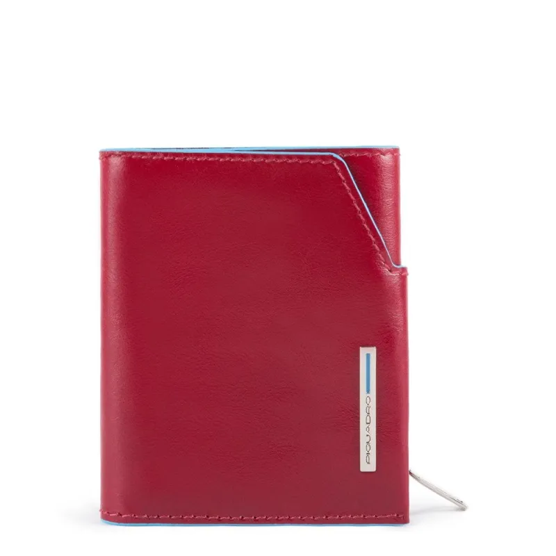 Piccolo portafogli uomo della collezione Blue Square di Piquadro, dotato di 4 fessure per carte di credito, un comparto per banconote, zip laterale per monete.