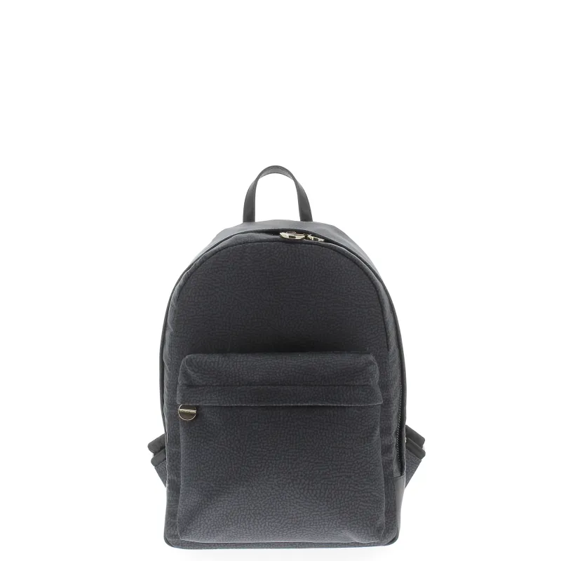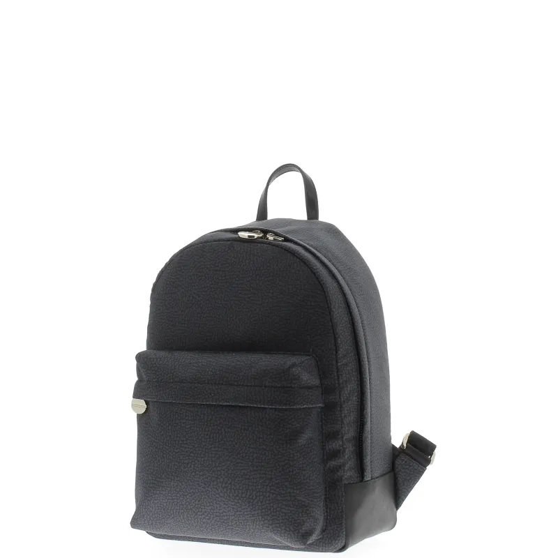 Zainetto donna della collezione Jet di Borbonese, realizzato in tessuto riciclato resistente e leggero con dettagli in pelle, dotato di apertura con cerniera, manico, tasca frontale con cerniera, spallacci in tessuto personalizzato regolabili.