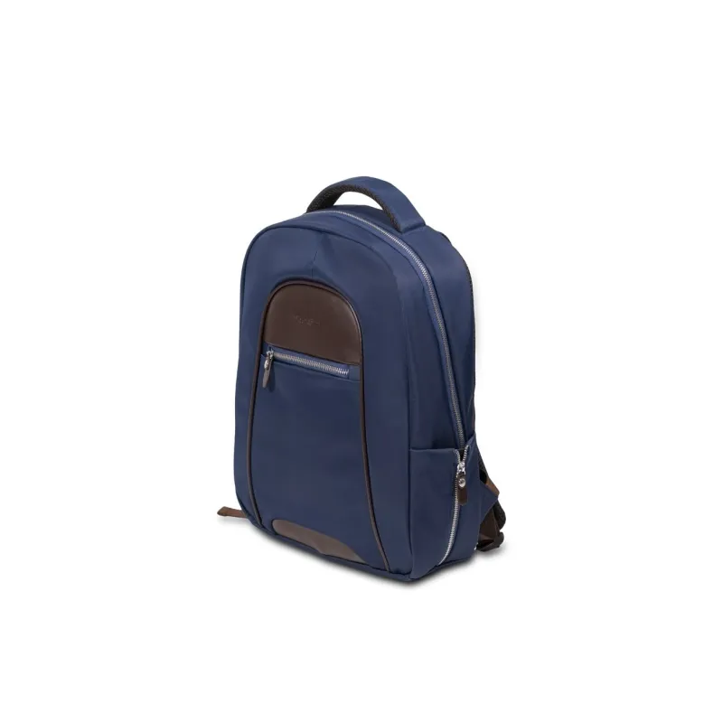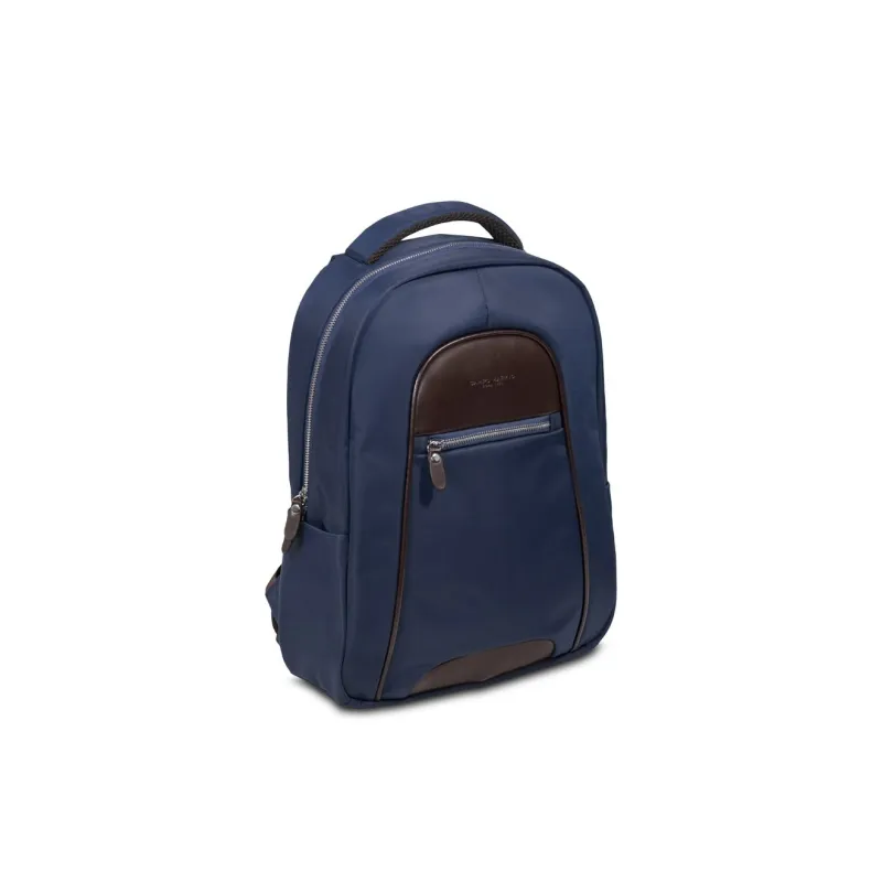 Zaino della collezione Campo Marzio, realizzato in resistente ed impermeabile tessuto con dettagli in ecopelle, dotato di ampio comparto con vano imbottito per computer e tablet, comoda tasca frontale organizzata, tasche laterali, schienale imbottito e traspirante, spallacci regolabili, passante posteriore per aggancio al trolley.