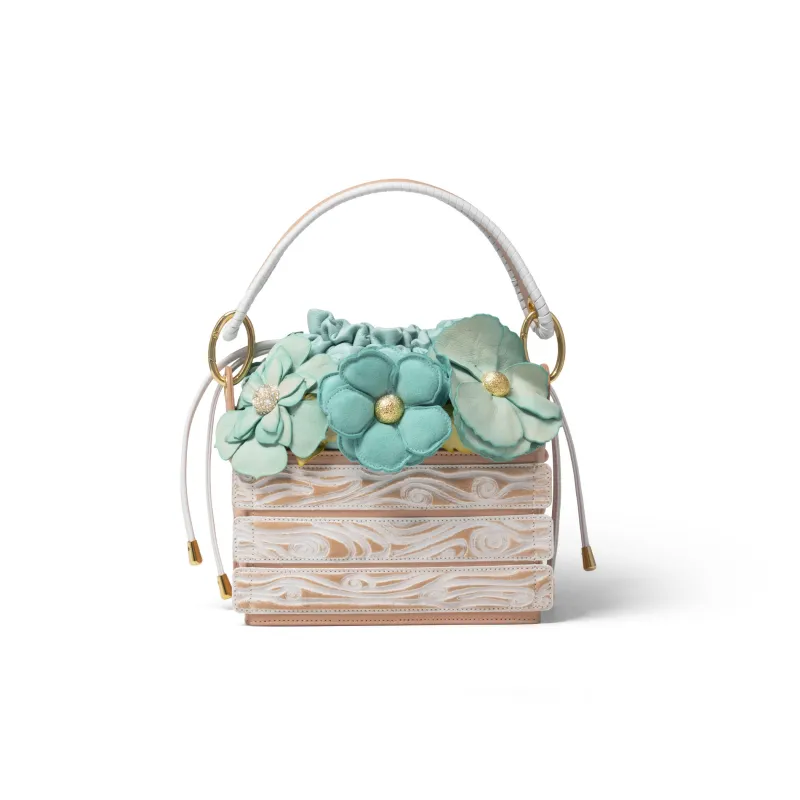 Questa stagione, la collezione Temi di Braccialini presenta i tanto attesi fiori raccolti in una delicata cassettina in stile shabby chic, realizzata in pelle, con stampa in lata frequenza effetto legno e tamponatura a mano. Le soffici corolle nei toni dell'azzurro, dell'acquamarina e del celeste, sono realizzati in varie tecniche ed esaltati da strass luminosissimi. La chiusura a coulisse in morbida nappa presenta dei finalini in metallo e il manigliotto singolo è intrecciato a mano con fettuccina in pelle bianca. Frontalmente un cartiglio ad incorniciare il logo.