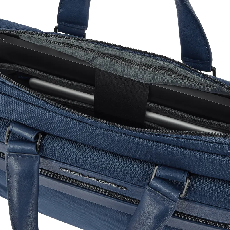 Cartella due manici della collezione Woody di Piquadro, realizzata con materiali riciclati e pelle naturale, dotata di scomparto principale con apertura con cerniera, tasca interna per computer e iPad®Pro 12,9" e organizzazione per smartphone, penne e accessori, tasca frontale con cerniera, passante posteriore per aggancio al trolley, tracolla regolabile e removibile.