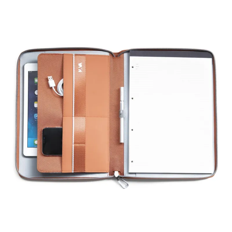 Portablocco formato A4 della collezione Cross di Nava, realizzato in tessuto poliestere con logo su PU effetto lucido/opaco, dotato di apertura con zip colorata a contrasto. L'interno è organizzato con un'ampia tasca porta tablet, portapenne, tasche per biglietti da visita, documenti e blocco notes.