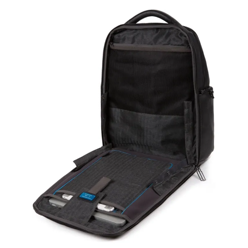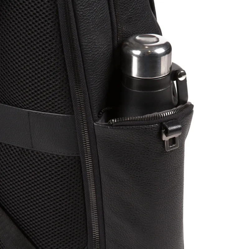 Zaino Fast-Check della collezione Tallin di Piquadro, realizzato interamente in pelle naturale, dotato di doppio scomparto co cerniera, manico superiore, organizzazione interna per computer e iPad®, shienale traspirante dotato di passante per aggancio al trolley e tasca nasosta, spallacci imbottiti e regolabili, tasche laterali porta bottiglia e porta ombrello.