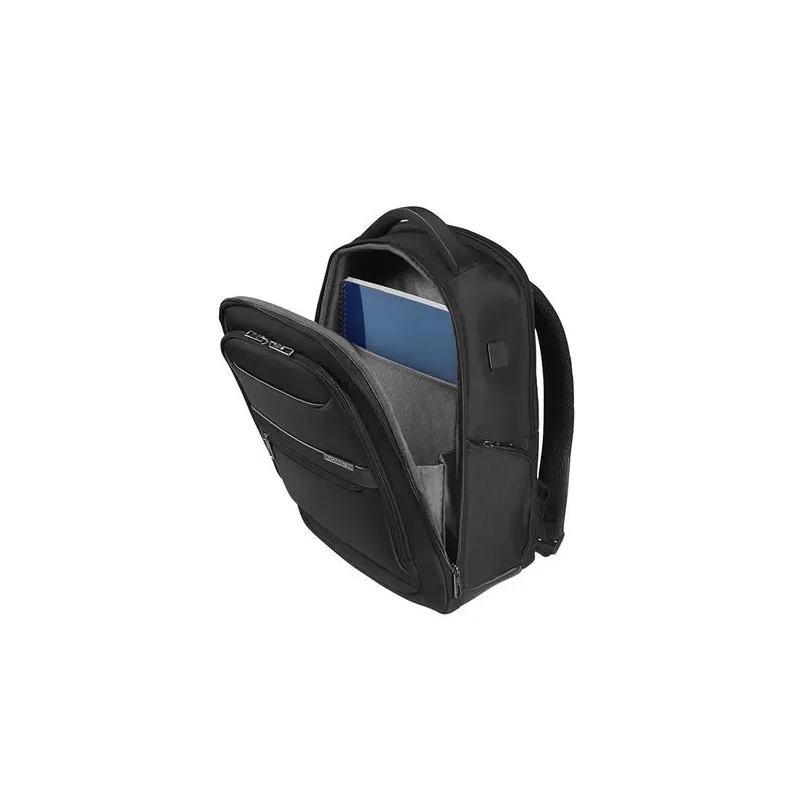 Zaino della collezione Vectura Evo di Samsonite,realizzato in resistente tessuto dotato di doppio comparto, uno dei quali organizzato con vano porta computer e porta tablet, manico superiore, tasche laterali, doppia tasca frontale, accesso USB per la ricarica dei dispositivi elettronici, passante posteriore per aggancio al trolley.