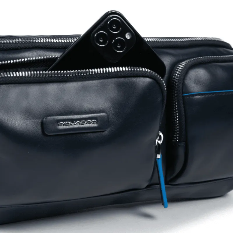 Marsupio della collezione Blue Square Revamp di Piquadro, realizzato in pelle naturale, dotato di comodo scomparto principale con chiusura con cerniera, due tasche frontali ed una tasca posteriore con cerniera.