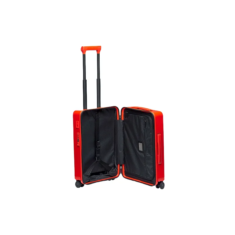 Trolley cabina della collezione Porsche Design, realizzato in policarbonato 100%, dotato di apertura con cerniera, combinazione a tre cifre e TSA necessario per i viaggi in USA, 4 ruote piroettanti, doppio comparto interno con divisorio con cerniera ed elastici fermabiti,accesso usb (USB A e USB C) per tutti gli smartphone di ultima generazione con sistema di chiusura di sicurezza e antipioggia.