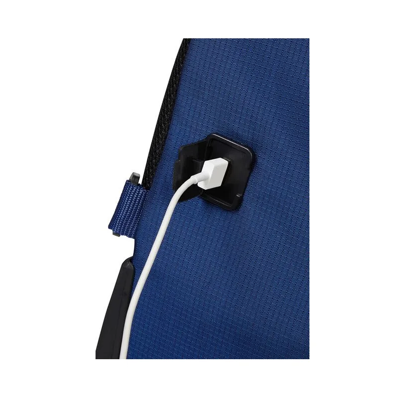 Trolley due ruote con portabilita' a zaino della collezione Fast di American tourister, realizzato con materiali riciclati con dettagli riflettenti, dotato di spallacci estraibili, ampio comparto con cerniera con cinghie ferma abiti, due tasche frontali di cui una porta pc, manico superiore, accesso USB .