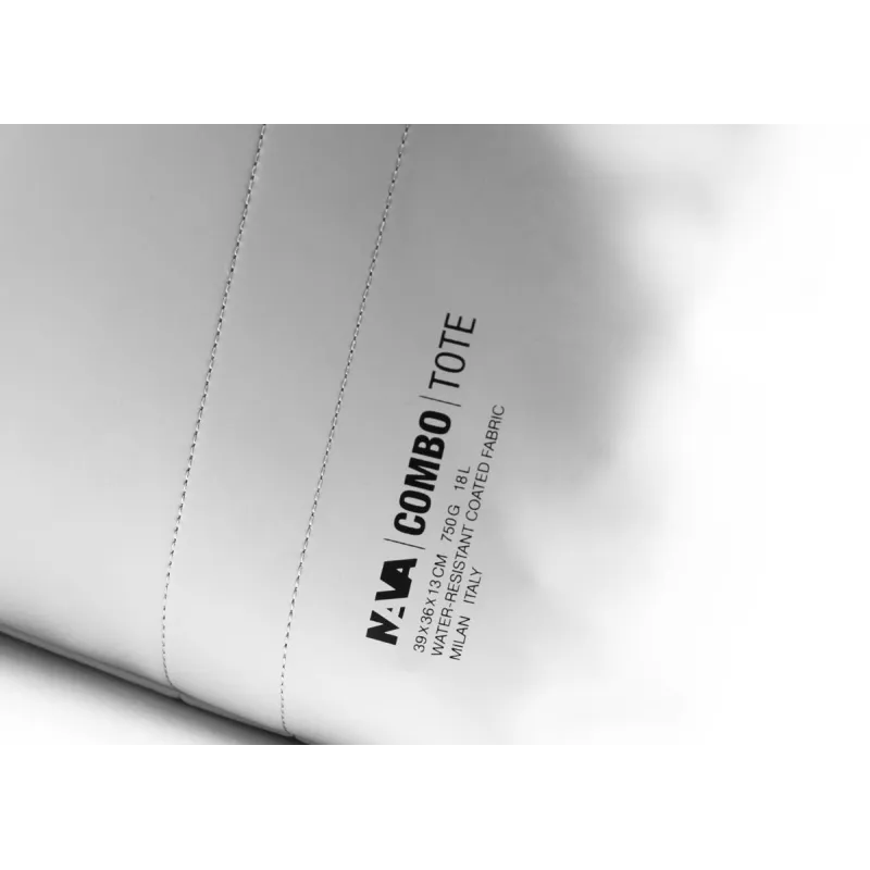 Tote bag della collezione Combo di Nava Design, adatta a chi ama gli outfit urban e lifestyle. Il design essenziale è interrotto solamente dal cartiglio realizzato in serigrafia con le specifiche tecniche della borsa. Realizzata in materiale tecnico liscio e resistente all'acqua con manici in tessuto e accessori metallici . All'interno dotata di un contenitore essenziale molto capiente con una busta chiusa con zip per riporre gli oggetti più preziosi, amovibile e utilizzabile anche da sola.