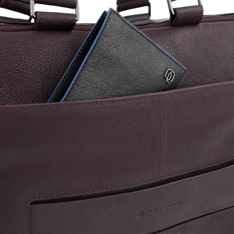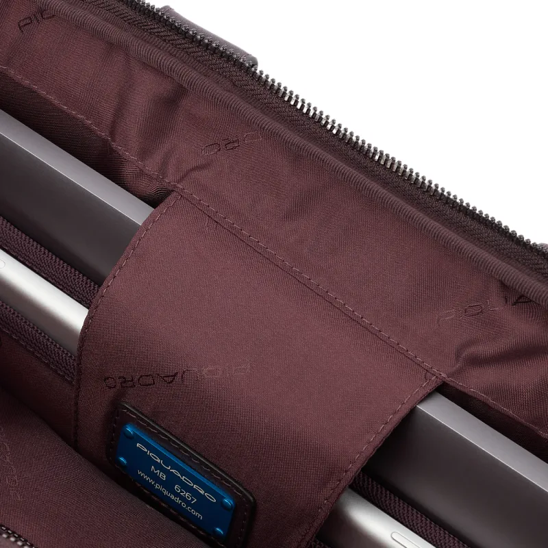 Cartella due manici della collezione Ronnie di Piquadro, realizzata in pelle naturale, dotata di doppio scomparto con chiusura con cerniera, uno dei quali organizzato con tasca imbottita per computer e iPad®Pro 12,9, tracolla regolabile e removibile, passante posteriore per aggancio al trolley, tasche frontali per oggetti di prima necessità.