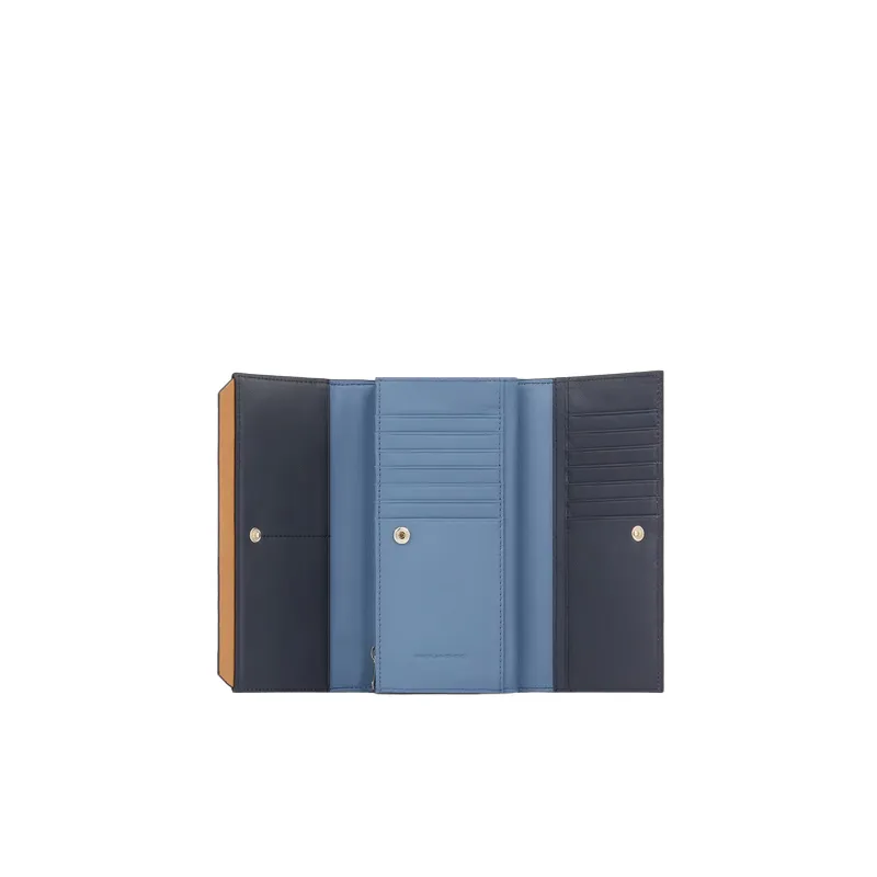 Portafogli donna con tasca per smartphone della collezione Circle di Piquadro, dotato di chiusura con pattina, 20 fessure per carte di credito con protezione anti-frode, tasca con cerniera per monete.