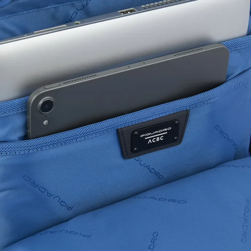 Zaino della collezione Corner 2.0 di Piquadro, realizzato in tessuto rigenerato, dotato di doppio scomparto con chiusura con cerniera, tasche laterali porta bottiglia/ombrello, tasca imbottita per computer e iPad®, spallacci imbottiti e regolabili, passante posteriore per l'aggangio al trolley.