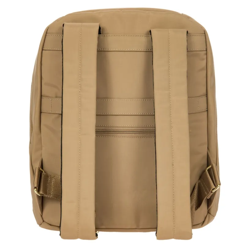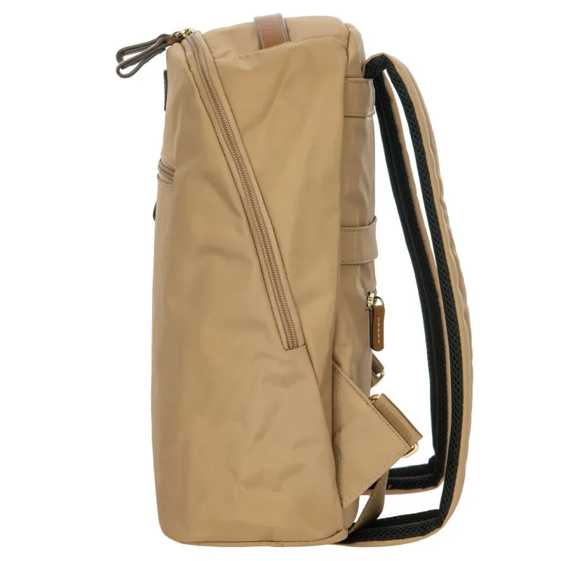 Zaino di misura media della X-Collection di Brics, realizzato in nylon riciclato, leggero e resistente con finiture in pelle. Dotato di spallacci regolabili in lunghezza lo rendono comodo da indossare e con la piccola maniglia superiore in pelle è portabile anche a mano. Dotato di tasche interne di cui una con zip. Esternamente è dotato di una tasca con zip sul fronte e di una tasca con zip sul retro ideale per contenere gli oggetti più preziosi. L'apertura principale è dotata di zip . Sul retro è presente una fascia per il fissaggio sulla maniglia del trolley.