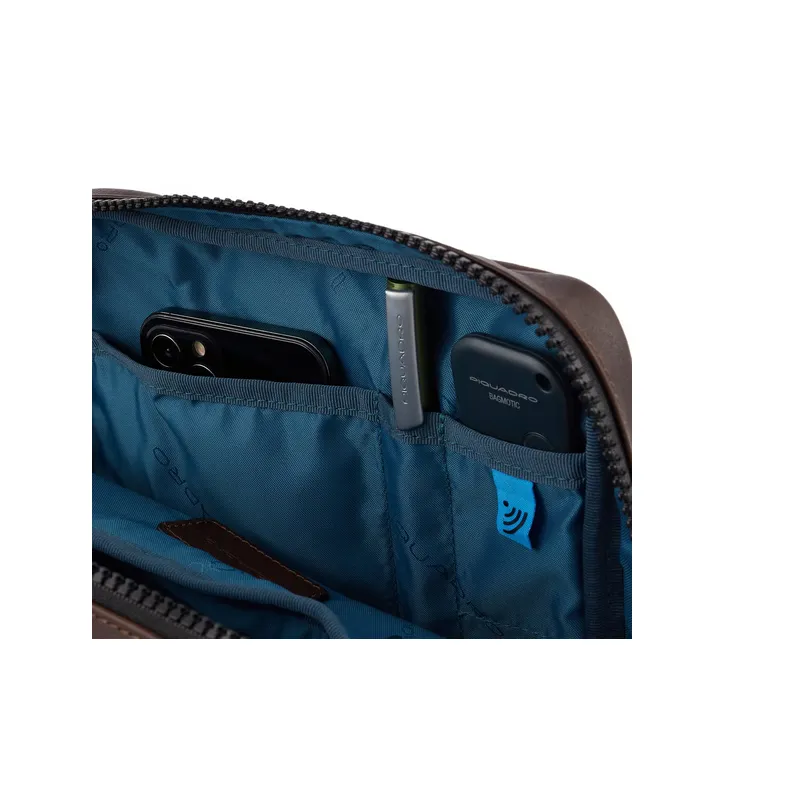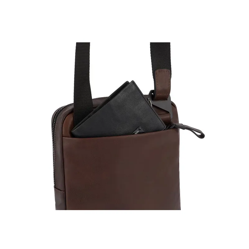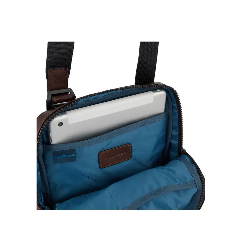Borsello porta iPad® della collezione Harper di Piquadro, realizzato in pregiata pelle naturale, dotato di chiusura con cerniera, tasca frontale con cerniera per oggetti di prima necessità, tracolla regolabile.