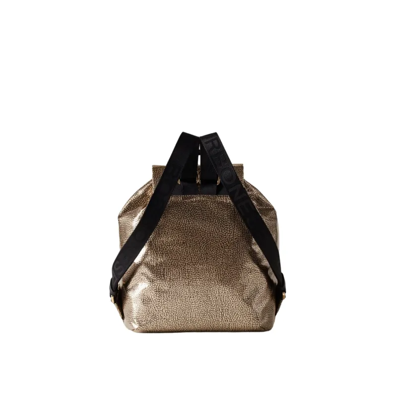 Zaino donna della linea inedita Eco Line Metallic di Borbonese, realizzato in nylon metallizzato e pelle. Gli spallacci regolabili sono di nastro di nylon logato. La chiusura principale è con coulisse coperta da una pattina mentre quella della tasca esterna è garantita da una zip con cursore a forma di vite, icona del brand. L'interno, foderato in tessuto jacquard, è dotato di scomparti e tasca zippata. Le metallerie sono in galvanica oro chiaro.