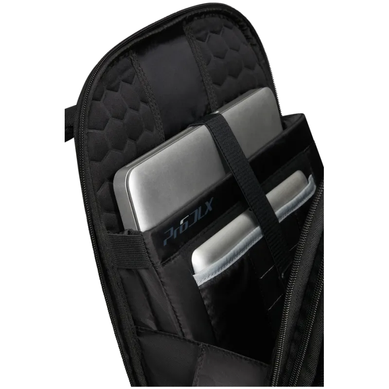 Zaino espandibile Porta computer da 15,6" della collezione Pro-Dlx di Samsonite, realizzato in nylon balistico, dotato di due scomparti con chiusura con cerniera, due tasche frontali, tasche laterali, spallacci ergonomici, sistema di aggancio al trolley con passante.