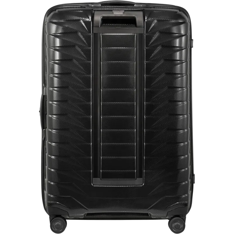 Trolley grande della linea Proxis di Samsonite, realizzato in resistentissimo polipropilene con lavorazione Roxkin, dotato di manico superiore e manico laterale, chiusura con combinazione e TSA necessaria per i viaggi in USA, traino con carrello doppio e 4 ruote, doppio scomparto interno con doppio divisorio, porta indirizzo integrato e retraibile.