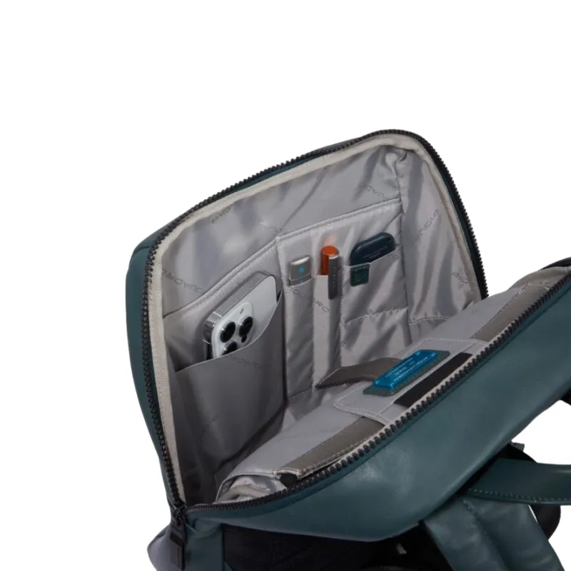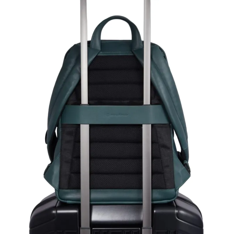 Zaino per computer o iPad®Pro 12,9 della collezione David di Piquadro, realizzato in soffice pelle naturale, dotato di unico comparto con chiusura con zip, protezioni antiurto e anti frode RFID, sistema di aggancio al trolley con passante, tasca posteriore nascosta, tasca frontale.