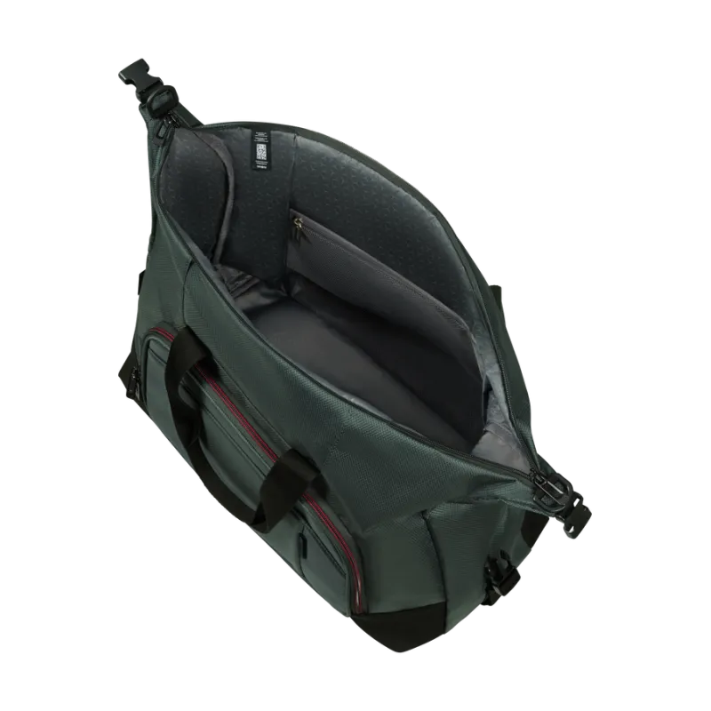 Borsone cabina della collezione Respark di Samsonite, realizzato interamente con materiali riciclati, dotato di due manici, chiusura con cerniera, tracolla regolabile e removibile, passante posteriore per l'aggancio al trolley.
