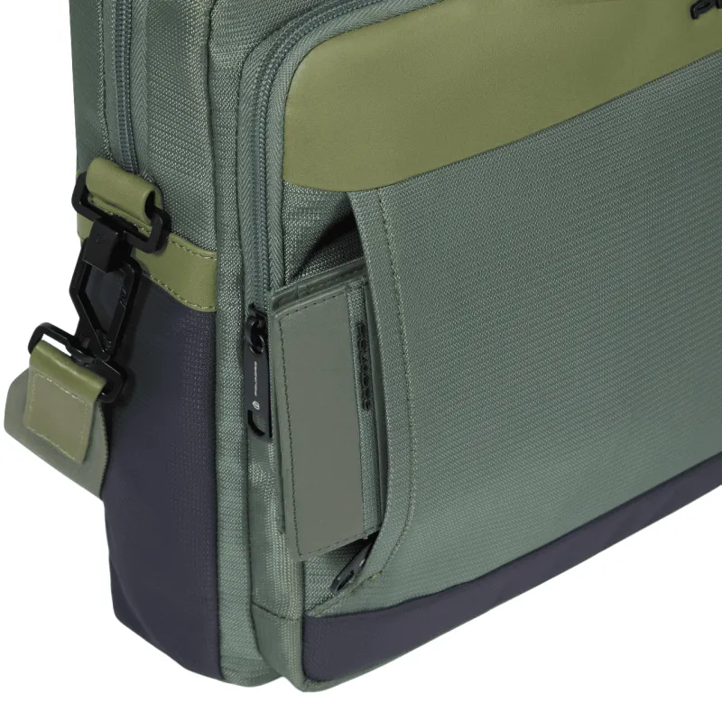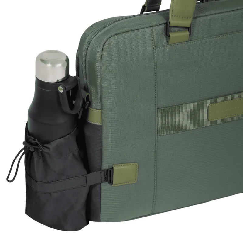 Cartella due manici porta computer da 14" e porta Porta iPad® della collezione Steve di piquadro, realizzata in resistente tessuto riciclato e pelle, dotata di unico comparto con chiusura con zip, tasche laterali porta bottiglia/ombrello, tracolla regolabile e rimovibile, sistema di aggancio al trolley con passante.