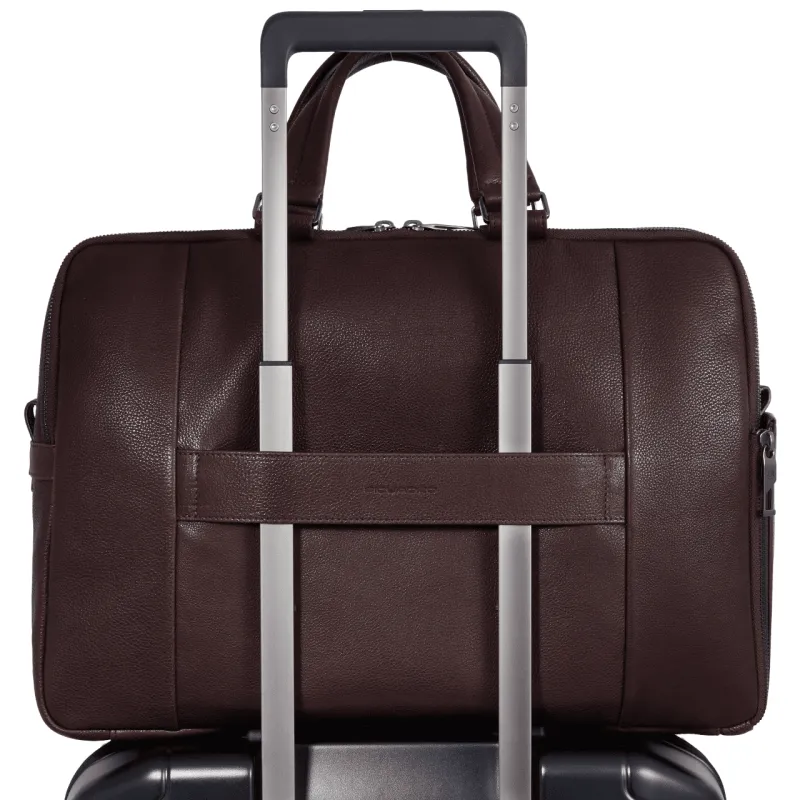 Cartella due manici della collezione Carl di Piquadro, realizzata in pelle naturale, dotata di due comparti con chiusura con cerniera, uno dei quali dotato di tasche per computer da 15,6 e iPad®Pro 12,9, tasche laterali, tasca frontale con zip, sistema di aggancio al trolley con passante, tracolla regolabile e removibile.