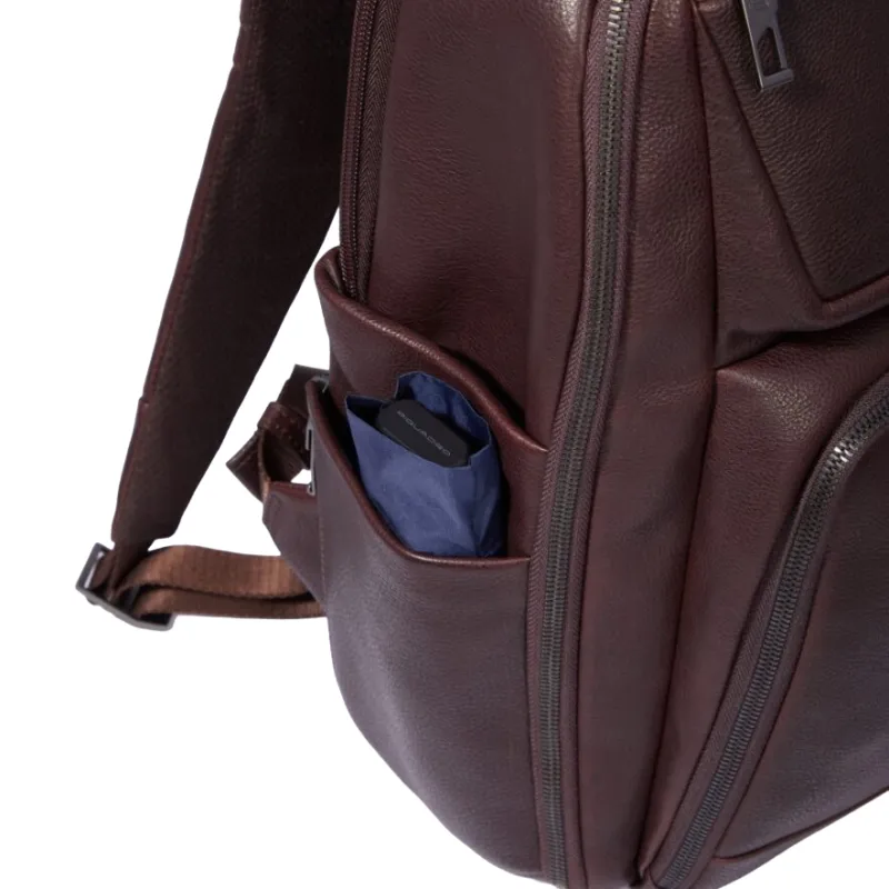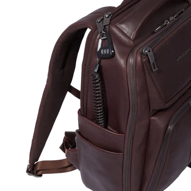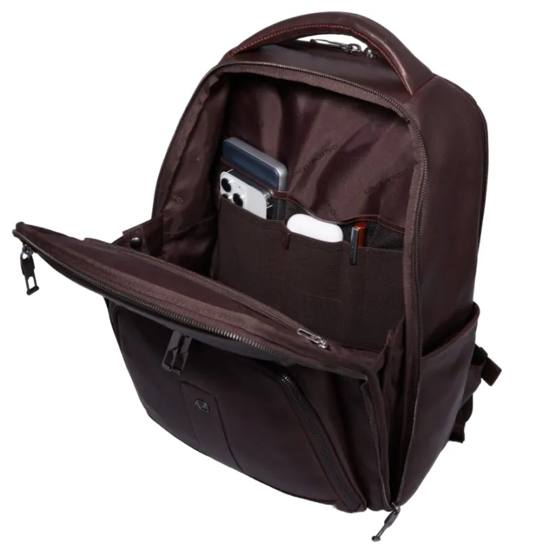 Zaino grande della collezione Carl di Piquadro, realizzato in pelle naturale, dotato di due comparti con chiusura con cerniera, uno dei quali dotato di tasche per computer da 15,6" e iPad®Pro 12,9, tasche laterali, tasche frontali con cerniera, schienale traspirante dotato di passante per l'aggancio al trolley.