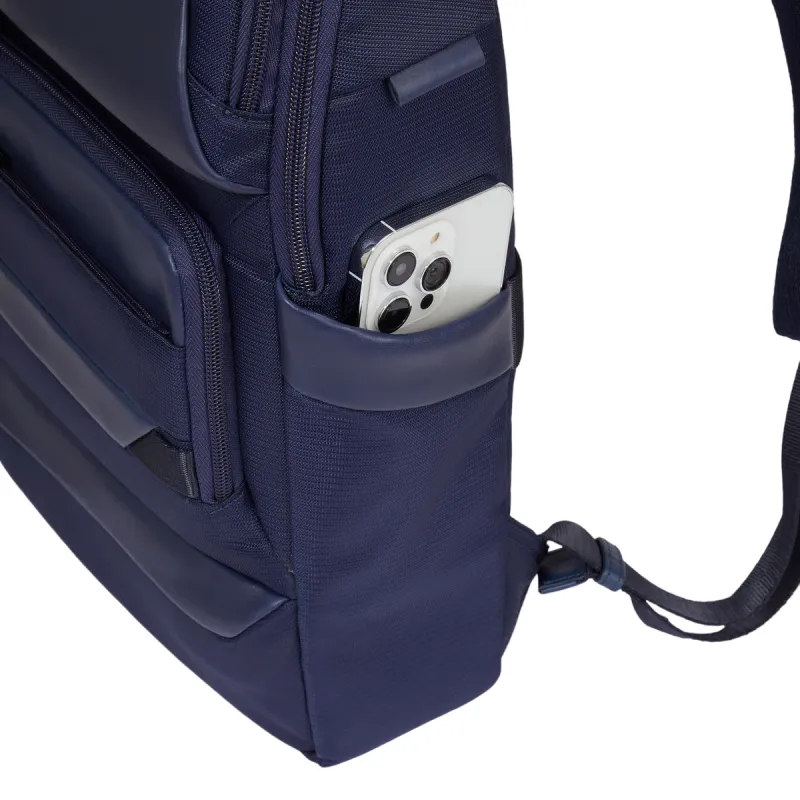 Zaino dalle dimensioni contenute porta pc da 13,3" e iPad® della collezione Nevet di Piquadro, realizzato in tessuto riciclato e pelle, dotato di unico comparto con chiusura con zip, lo schienale traspirante è dotato di tasca per l'aggancio al trolley, gli spallacci sono imbottiti e regolabili, tasche laterali porta bottiglia/ombrello.