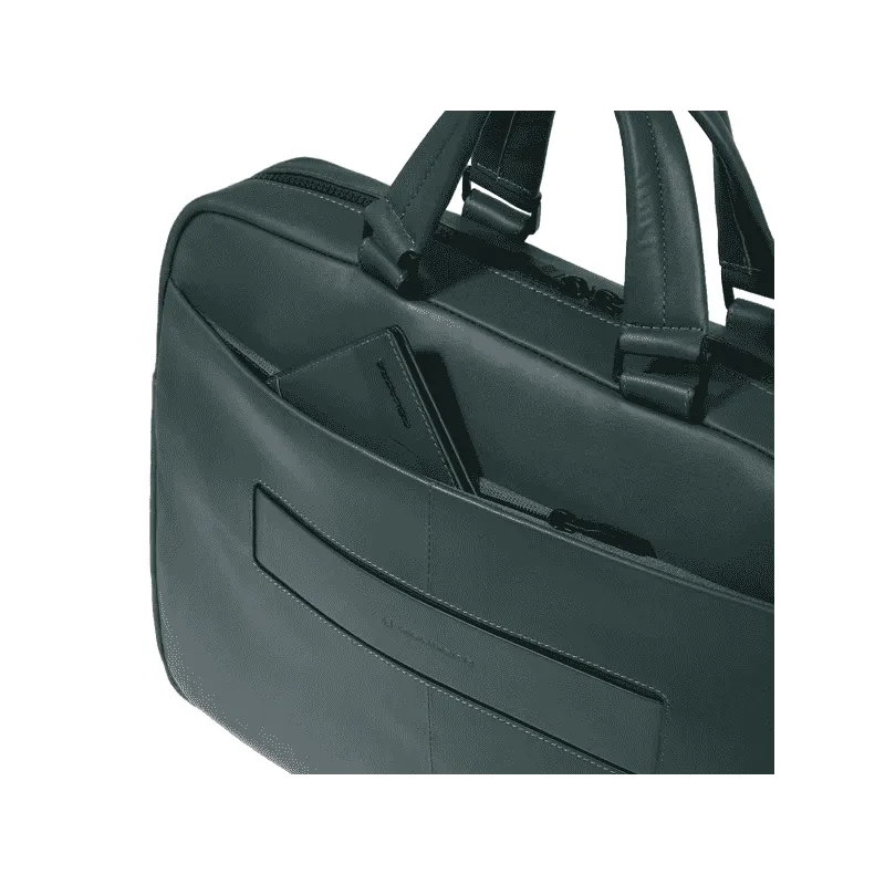 Cartella due manici della collezione Liko di Piquadro, realizzata in pelle naturale con dettagli in tessuto, dotata di unico comparto con chiusura con cerniera, tasca interna imbottita per computer da 15,6" e Ipad, tracolla regolabile e rimovibile, sistema di aggancio al trolley con passante, due comode tasche frontali con zip e tasca posteriore con zip.